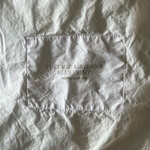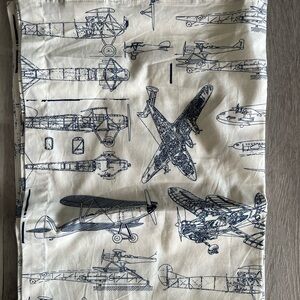 Kids vintage airplane blueprint themed bedding set including twin size flat sheet and small pillow case. From Restoration Hardwares kids and baby line. No fitted sheet, just flat sheet and pillow case. Never used.