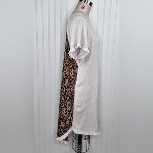 Linen Blend Short Sleeve Round Neck Animal Print Back Dress with High Low Fishtail Scoop