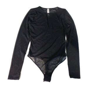 New with tags Auden Long-sleeve mesh bodysuit in black Sheer fabric with added spandex Pullover design with crotch snap Cotton gusset Approx pit to pit: 12.75 in Semi-transparent Women's size XS UPC 198101-032713