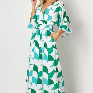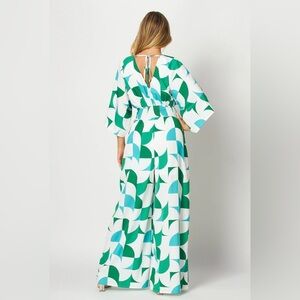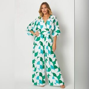NWT Lauren Wide Leg Printed Jumpsuit | Green Blue Geometric | V-Neck Belted