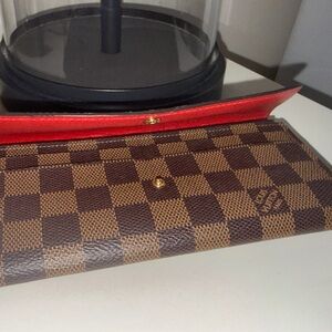 Elegant checkered wallet with a striking red button. Classic Louis Vuitton style.