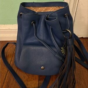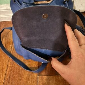 Blue leather mini backpack. Excellent like new condition. Adjustable straps and drawcord closure.