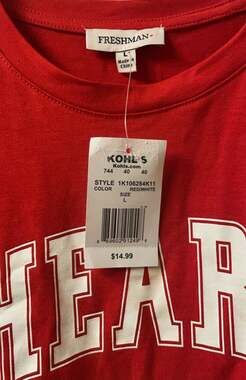 Freshman Red "Heart Breaker" Short Sleeve Graphic T-Shirt for women, size Large. This vibrant red graphic tee features "HEART BREAKER" in white lettering across the front, making a bold statement. Crafted from a blend of 69% Polyester, 28% Rayon, and 3% Spandex, it offers comfort and a slight stretch. Perfect for casual wear, showcasing a playful and edgy style. New with tags, never worn.