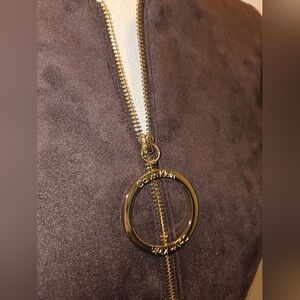 This elegant brown dress is perfect for any occasion. Its sleek design and rich color make it a versatile addition to your wardrobe. Faux Suede Velvety Texture. Body Con and GORGEOUS Zip Back and Zip Front With Gold Tone O Ring and Hardware. Go from day to night easily.