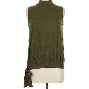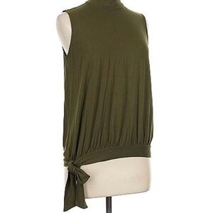 Chic, elegant, and so easy to style. This olive green mock-neck sleeveless top features a relaxed drape with a flattering gathered hem and a side tie detail. Effortlessly polished — think classic Ralph Lauren vibes.
