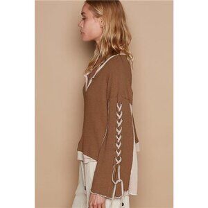 POL Lace-Up Sleeve Color Block Ribbed Knit Top