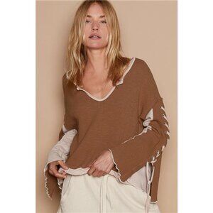 *The Lace-Up Sleeve Color Block Ribbed Knit Top is a trendy and eye-catching piece for your wardrobe. Featuring a notched neck and long sleeves with lace-up details, this top exudes a stylish and edgy vibe. The oversized fit and ribbed knit construction offer both comfort and a modern aesthetic. With contrasting color block panels, this top is a chic and versatile option for adding a pop of style to your outfits. Stay on-trend and elevate your look with this unique and fashion-forward ribbed knit top.