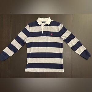 Stylish polo with grey and navy stripes in excellent condition. Features classic signature Polo embroidered logo. Perfect for casual wear.