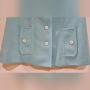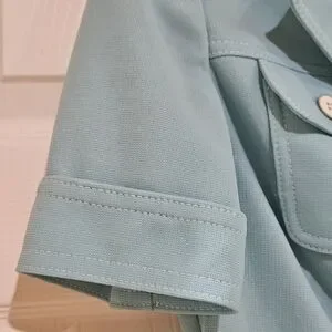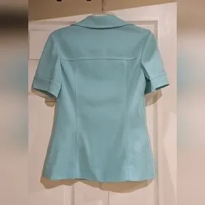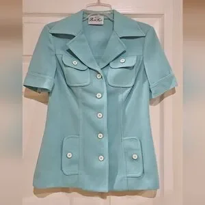 Enhance your wardrobe with the elegant vintage pastel blue short sleeve blazer by Butte Knit. This stylish piece combines sophistication with comfort, featuring a classic button-down design perfect for any occasion.