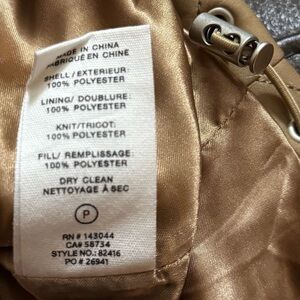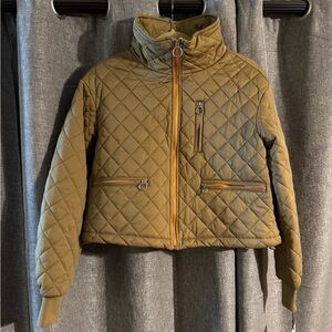 Stay stylish and warm with this quilted cropped jacket, tan with orange zippers. Perfect for any occasion.