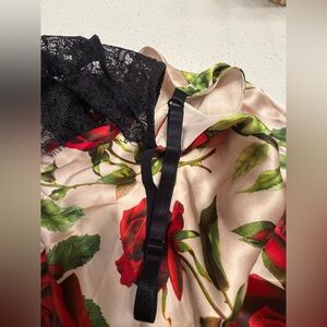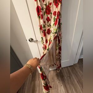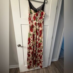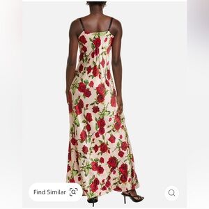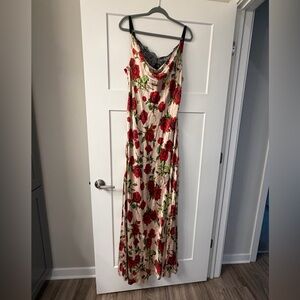 Chic satin dress with a flora pattern. Ideal for elegant events.