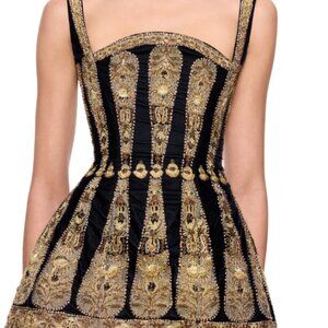 Introducing the Abbotsford Mini Dress in Honey Gold Metallic, a captivating piece crafted from bonded fabric for a structured and sophisticated look. This mini dress features a fitted under bodice and skirt, enhancing the silhouette. The dramatic and structural layered pleated fan detail on the front and back of the bodice adds a touch of elegance.