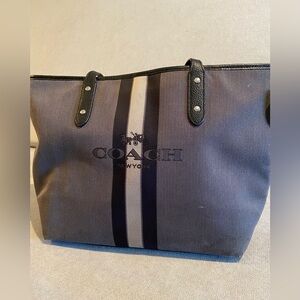 Stylish Coach tote with black and gray design. Features dual handles and signature logo.