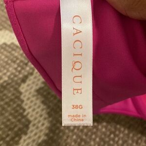 Cacique bra, size 38G this is the lightly lined full coverage bra. The color is hot pink. There are little black spots on one cup of the bra. See pictures for more details overall in good shape.