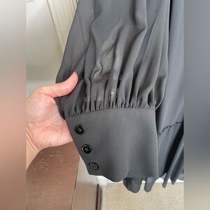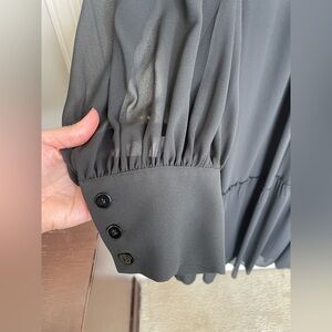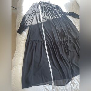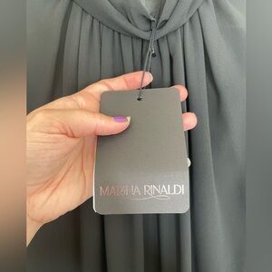 Channel timeless elegance with this brand new with tags Marina Rinaldi “Uscio” dress. Crafted in Italy, this flowing black maxi dress features sheer chiffon overlay, gathered high neckline, and billowed long sleeves with wide cuffs for a sophisticated, ethereal silhouette. The back button closure and tiered hemline add subtle structure to this romantic piece.