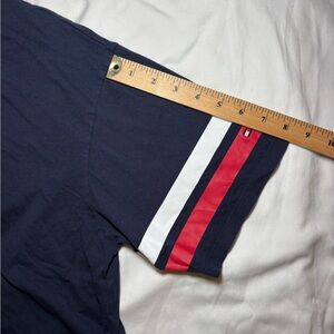 Stylish navy V-neck with signature red and white trim. Classic Tommy Hilfiger design.