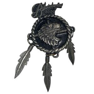 Each pin features detailed pewter craftsmanship with bold biker imageryeagles, feathers, motorcycles, and roses. These pins were sold as event memorabilia at their respective rallies and make a great addition for any motorcycle enthusiast or collector of biker memorabilia.