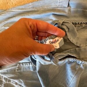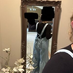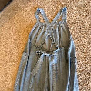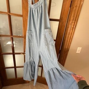 Stylish and comfortable light blue denim overalls perfect for casual outings. Features a relaxed fit and bell legs, cute tie in the back, lightweight and flowy