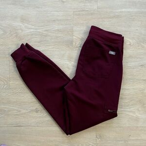 Stylish burgundy joggers with a comfortable fit. While photographing I noticed a darkened area around the bottom of the lower zippered pocket which did not come out after being stain treated. It’s not incredibly noticeable unless you’re in a brightly lit area, but it is there as a heads up, so I will gladly take closer pictures if needed!