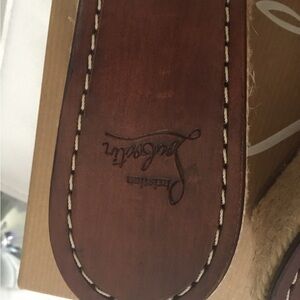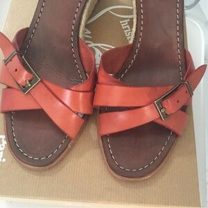 Elegant orange leather sandals with a stylish buckle. Perfect for adding a pop of color, best fits a size 7, gently worn