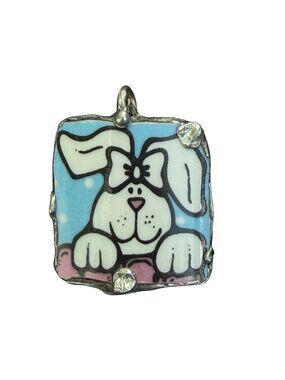 Once upon a time, a shattered Wedgwood Peter Rabbit plate found its way into a silversmith's hands. With care, it was transformed into this enchanting pendant. This dainty pendant tells a tale with a painted bunny.