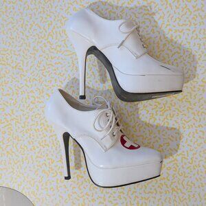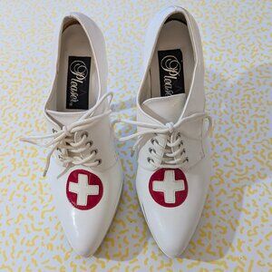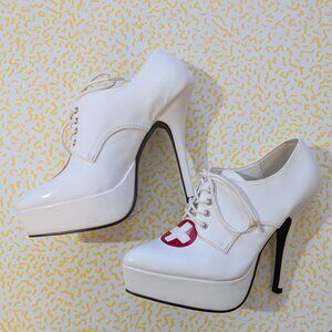 These shoes are very sexy discontinued medical fetish platform heels by Pleaser. The style is Indulge 562 and they are made of vegan materials. They have a red circle with a nurse cross on the front and lace up the front like spectator shoes. The heel height is 5" and the platform is 1.25".
