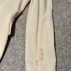 Classic contemporary off white unlined blazer in silk & cotton blend is made in Italy, & in excellent condition. I've only worn it twice. The style & colour versatility offer year long use & can be worn to dress up pants, skirt, or a dress but also looks great with denim. It says size large but I'm typically a size 8 & has a very slightly oversize fit.