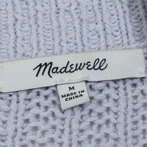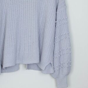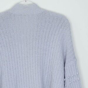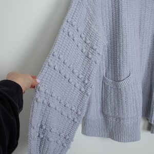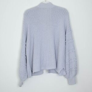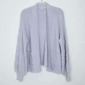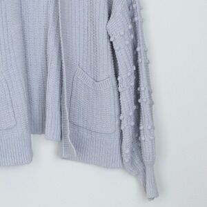 A Madewell light blue open front knit cardigan sweater. This cozy piece features long balloon sleeves adorned with charming bobble details and convenient front pockets. Perfect for layering over a casual outfit or adding a touch of warmth to a dress for a relaxed brunch or evening out.