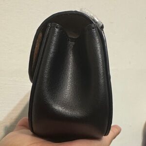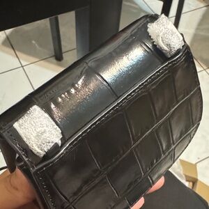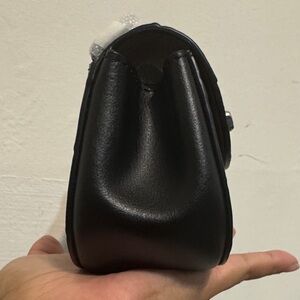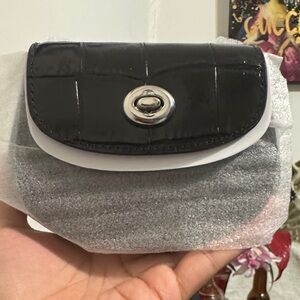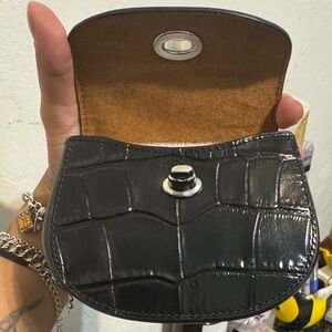 Elegant mini bag with a sleek chain strap. Features a stylish turnlock closure. Perfect for essentials.