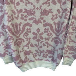 Charming vintage Felicia sweater featuring a beautiful pink-and-cream jacquard pattern with subtle metallic threading throughout. Cozy, soft, and full of classic vintage character — perfect for cottagecore, feminine winter styling, or 80s/90s-inspired outfits.