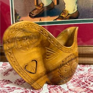 Beautifully carved wooden pitcher with intricate designs. Perfect for home decor.