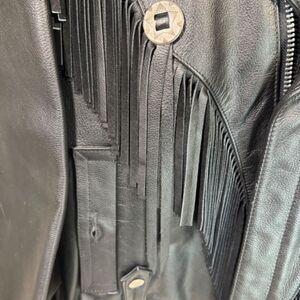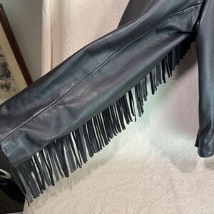 Previously worn; fringe leather jacket with a bit of a western flair; outer shell is 100% leather; lining is 100% nylon; 100% polyester padding. #bootandshoetraders