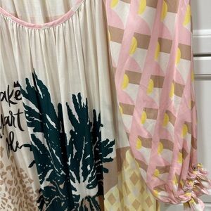 Flowy maxi dress with tropical palm tree print. Features shades of orange, green, and cream.