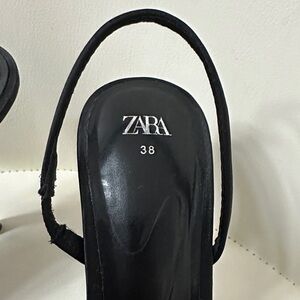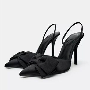 Chic black heeled slingbacks with bow detail at front. Back strap with elastic. Pointed toes. Perfect for holiday parties!