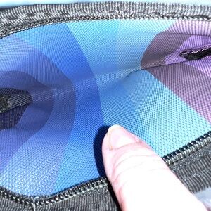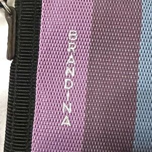 Featuring a chic striped design in purples, blues, and black, this bag is perfect for any occasion.