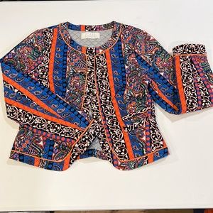 Textured, geometric lightweight knit 75% silk blend sweater. Dynamic knit top by Jhane Barnes. Features geometric patterns with a vibrant color mix.