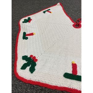 Vintage knit Crochet Christmas Tree Skirt White Red Green 43” Holly Berry Candle