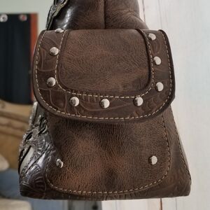 This stylish brown handbag features zipper inside and out for a concealed carry. All stud embellishments are intact, tons of pockets and space for even those who arent packing heat.