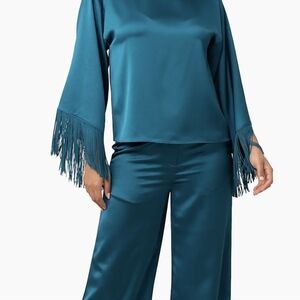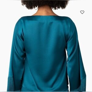 This elegant teal blue satin-look Viscose sleek boat neck top features stylish fringe details on the sleeves, perfect for adding a touch of sophistication to any outfit.