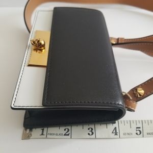 Features: black white olive green and brown, leather, snap closure, card slot, back zip compartment, skull, gold tone hardware, adjustable wide leather crossbody strap, leather handle, designer logo, authentic, luxury