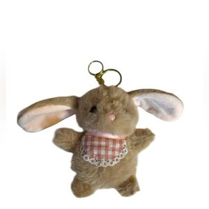 Adorable plush bunny keychain featuring a soft cream color and a charming pink gingham bib. Perfect as a cute accessory.