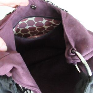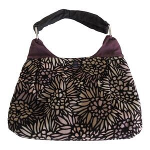 This stylish, bold floral shoulder bag features a velvet-edged outline, gorgeous lining and suede accents and handle. The single compartment has a snap closure with zipper pocket inside. Gently Used Condition Please view photos for full description and measurements.