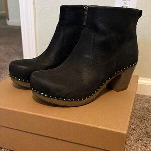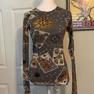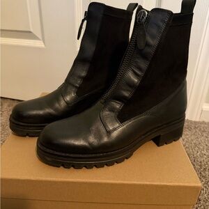 Stylish black zip-up jacket with drawstring collar. Features double layer long sleeves with ruching, front pockets, thumb holes, vented back. Size 8 but tag was removed.