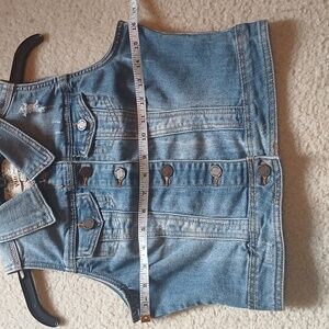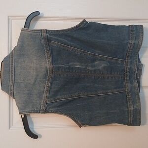 Chic sleeveless denim vest. Features button closure and classic collar. Distressed accents add style. See photos for details.