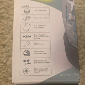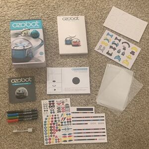 Ozobot Starter Pack featuring a blue robot. Includes interactive features for learning and play. 25 activities included. Note that cards for activities 3, 4, and 6 have writing, and a few stickers used as pictured. Fun coding learning activity. Non smoking home.