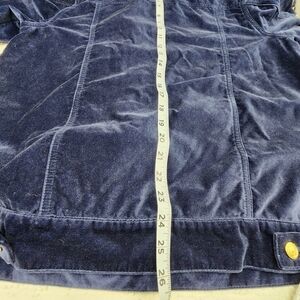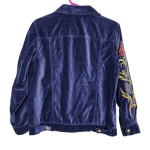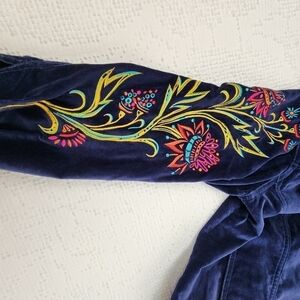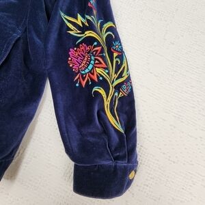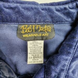 Vintage Bob Mackie Wearable Art button down jacket in size small. Dark blue velvet with funky and unique embroidery on the sleeves and chest. Partially lined. Shell is 100% cotton, lining is 100% polyester. There is an imperfection in the velvet toward the botton front. Shown in photos. Approximate flat lay measurements are also shown in the photos. There are general signs of wear including an imperfection in the fabric towards the bottom. Otherwise, good vintage condition.