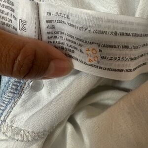 A fun pair of distressed curve love jeans in a light wash blue color. The jeans have distressing throughout; the knees, around the waist, and on the bottom cuffs. Good preowned condition