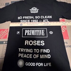 Primitive x Outkast collaboration graphic t-shirt in black. The front design features a black and white image of Outkast members Andre 3000 and Big Boi with the Primitive logo below. The back of the shirt displays text including "SO FRESH SO CLEAN SINCE 1992 ATL WORLDWIDE PRIMITIVE ROSES TRYING TO FIND PEACE OF MIND GOOD FOR LIFE" along with the Outkast logo and Primitive branding. This shirt is new with tags.