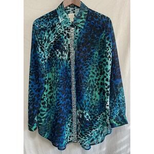Stunning NWT Chico's Watercolor Spots sheer blouse in a vibrant teal/blue/black animal-inspired print. Features a glamorous rhinestone-trim placket, button front, and flowy lightweight fabric. Size 2 (equivalent to a Chico's Large).