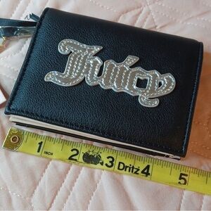 New with Tags! Adorable bi-fold wallet with βJuicyβ on front, gold tone hardware, and snap closure. Black exterior, white interior with some Juicy logo lining as well. Bill slide pocket, credit card slots, zip coin pocket inside with attached key ring, too. Super cute! Great stocking stuffer or gift. From Juicy Couture. π